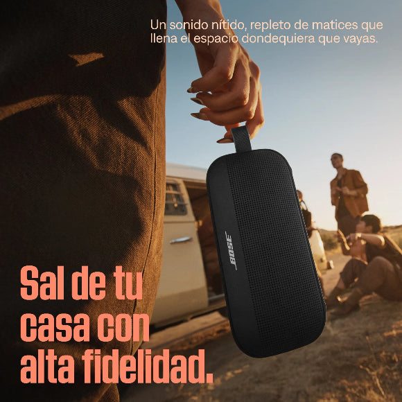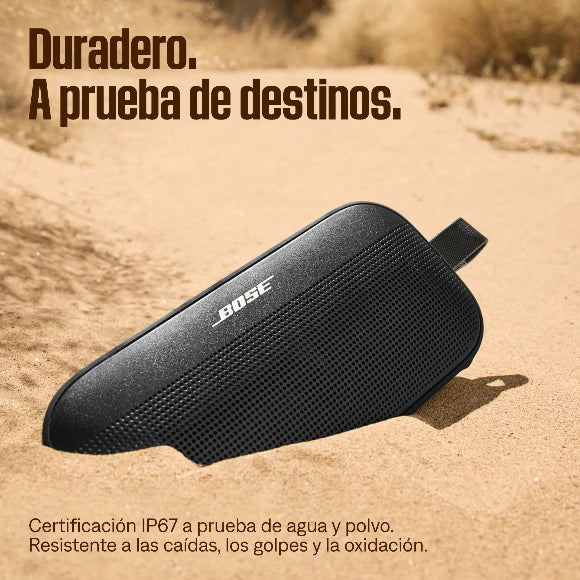 Presiona reproducir y ve adonde gustes con el altavoz portátil Bose SoundLink Flex (2.a gen.). Sonido sorprendentemente grande y potente en un tamaño supercompacto: perfecto para compartir música y buenos momentos en cualquier lugar del planeta. Diseñado para durar, para ir adonde te lleve el ritmo.